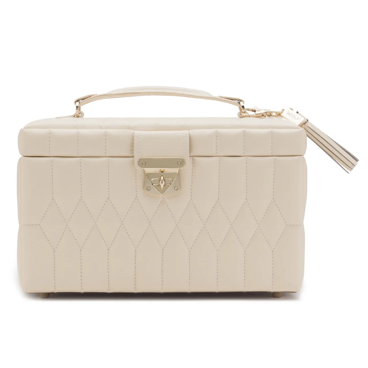 The embodiment of sophistication and style. The Caroline Medium Jewelry Case, a timeless classic with elegant soft lines of the 50’s, supple diamond quilted leather accented with gold hardware. This refined case is the perfect home for your precious jewelry and heirlooms.