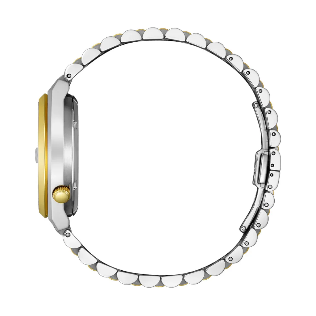 Designed for those who value refined simplicity and modern functionality, this 40mm timepiece perfectly balances elegance and versatility. The two-tone stainless steel case flows effortlessly into an integrated bracelet that offers both comfort and a polished look. The recessed crown at 4 o’clock enhances the smooth silhouette, creating a streamlined aesthetic from every angle. Beneath the sapphire crystal lies a textured green dial that captures light beautifully, adding a hint of sportiness to its sophisticated charm—making it an ideal accessory for any occasion, from daily wear to formal settings.