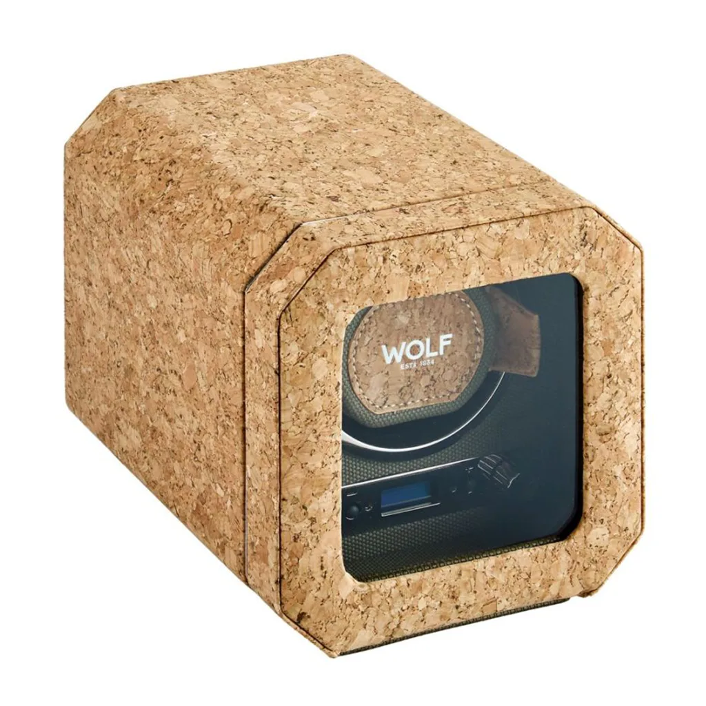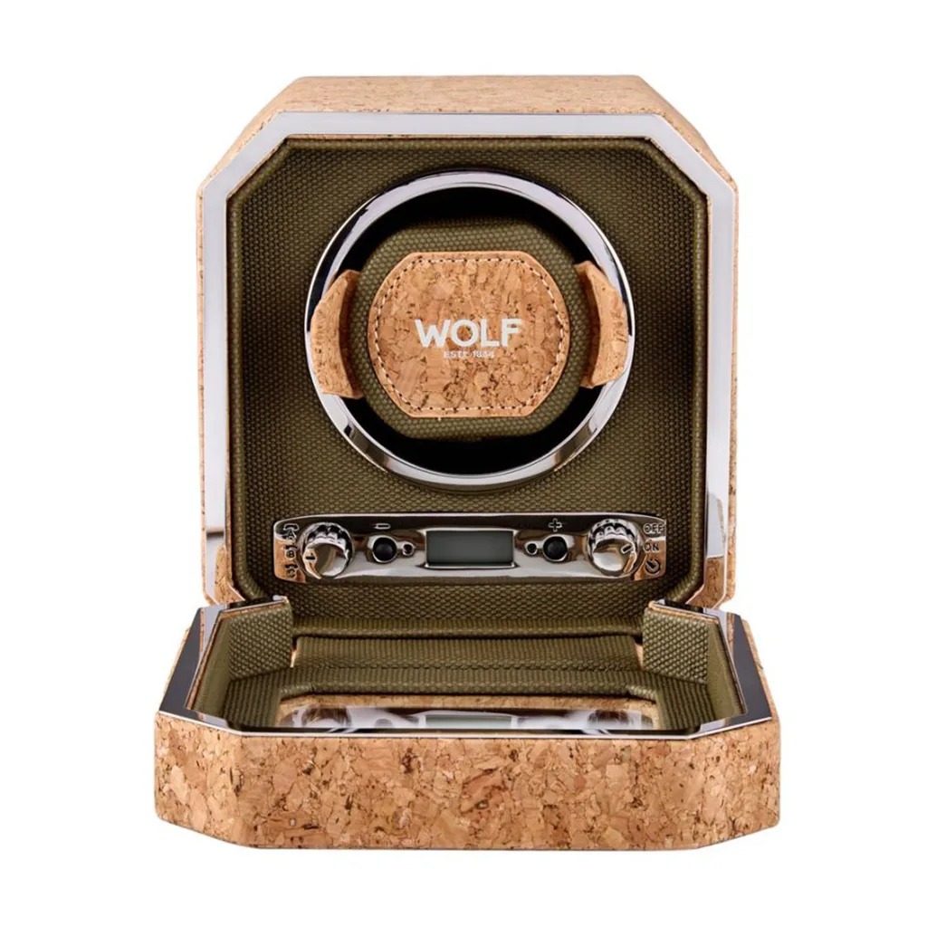 The Cortiça Single Watch Winder II has an octagonal shape with smooth edges and a khaki green interior giving it a unique and natural style. Hand made from sustainably grown Portuguese cork.
