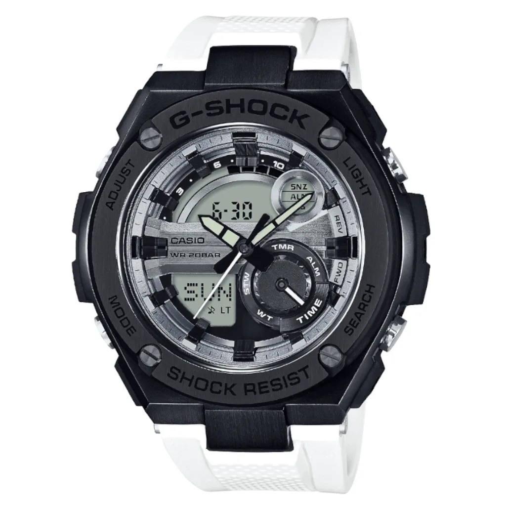 From G-SHOCK, the watch brand that is constantly setting new standards for timekeeping toughness, comes new G-STEEL model with “layer guard structure.” This new model maintain world-renowned G-SHOCK toughness: The GST-210B models combine metal cases with resin bands, Black and white coloring creates designs that are simple, yet bold. Large hour markers feature prominent edges that enhance visibility. The face, hour markers, and dials are all layered, for a 3-dimensional look that adds to visual impact. Super Illuminator ensures easy reading in the dark.