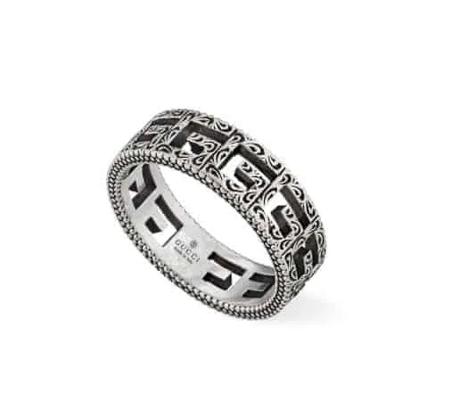 Pulled from the seventies’ archives, the Square G is reworked in a defining cut-out motif on this ring crafted from aged 925 sterling silver. The geometrical pattern is embellished with Arabesque-style engravings, while textured edges trim the accessory.