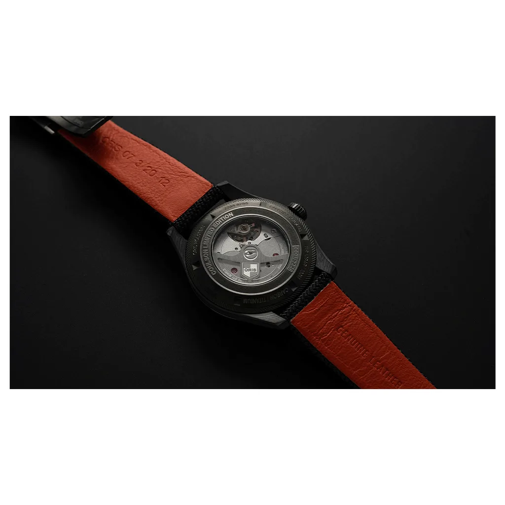 The Oris ProPilot 41mm 01 400 7784 8786-Set stands out with its distinctive features. The 41mm case is crafted from a fusion of 3D-printed carbon fiber and PVD-coated titanium, resulting in a lightweight yet robust structure. This innovative blend ensures durability while maintaining a modern aesthetic. The fiery orange dial pays homage to the passion and determination of airborne firefighters, capturing attention with its bold hue. Luminescent hands and markers enhance readability, even in low-light conditions.