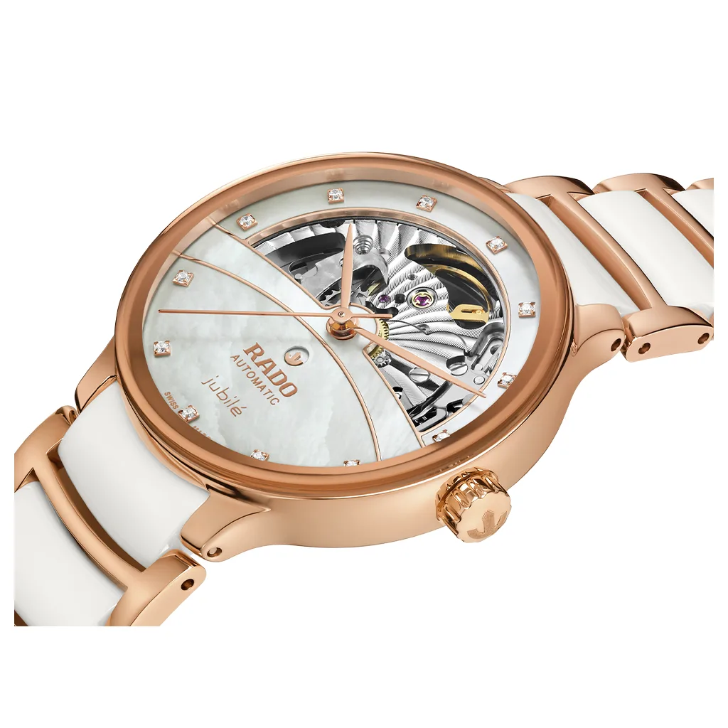 Experience the harmonious blend of artistic expression and design stylings with the Rado Centrix Open Heart watch. As the constellations write their eternal stories above our heads, they build bridges for lovers to meet. A large window, reminiscent at once of dawn and dusk, beautifully frames a state-of-the-art R734 automatic movement with 80 hours of power reserve and an antimagnetic NivachronTM hairspring, as well as a deeply elegant rippled-sunlight ondulé soleil motif on chosen component surfaces. The overall appearance of this iconic timepiece is completed with adjusted case lugs and a bracelet made of polished rose-gold-coloured PVD-coated stainless steel with white high-tech ceramic middle links. The white mother-of-pearl dial with 12 diamonds, emphasised with the rose gold coloured printed “jubilé” logo, matches perfectly with the hands. The watch is water resistant down to 50 m.