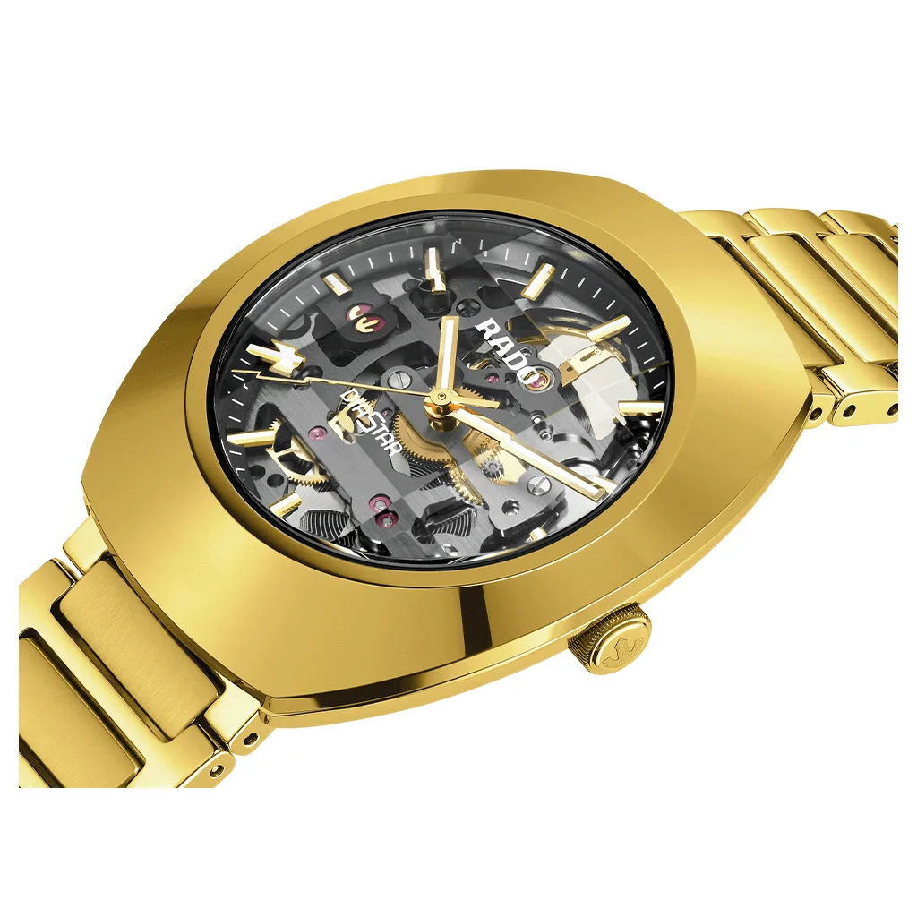 The DiaStar Original Skeleton features another variant of the high-quality R808 automatic calibre, anthracite-grey coated and complemented by various elements in its workings, for a lovely visual dance of contrasts. Thanks to sapphire crystal windows on both front and back, the automatic movement can be appreciated in full technical elegance, providing 80 hours of power reserve. An anti-magnetic Nivachron⢠hairspring ensures that everything stays extremely precise and reliable, in a movement that has been tested in a full five positions. Its open structure, and the impressive R808 skeleton movement give a lighter, airier note to the new DiaStar Original, a perfect design counterpoint inside the visual frame created by the polished yellow gold coloured Ceramos⢠bezel. The darker tone is further set off by floating yellow gold coloured indexes and hands with white Super-LumiNova®, for great readability even in low-light conditions.