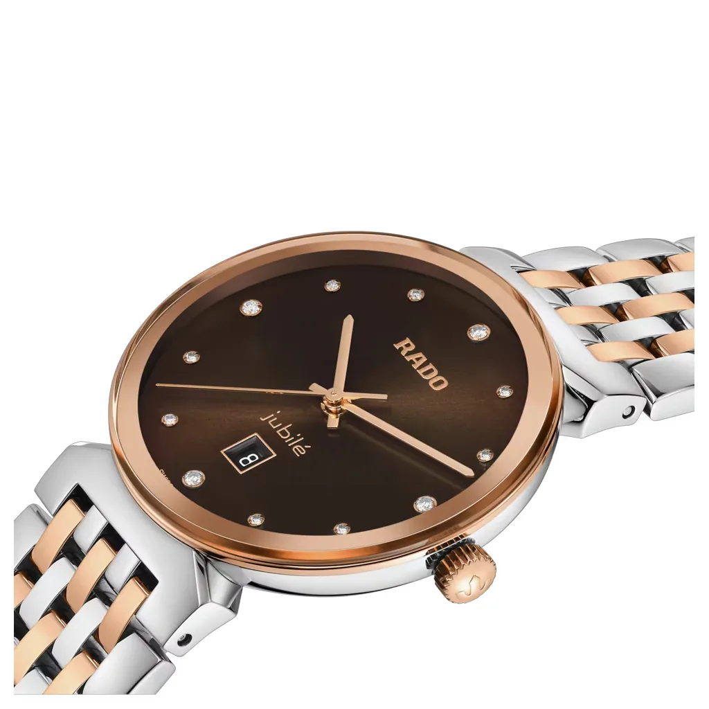 The brown sunray dial of the Rado Florence Classic is a striking feature, adorned with 12 diamonds that add an extra touch of luxury. The printed ājubilĆ©ā logo on the dial emphasizes the high-end quality of the watch, perfectly complemented by the rose gold-coloured hands. The bracelet is crafted from polished stainless steel with rose gold-coloured middle links, offering a chic and sophisticated look that transitions effortlessly from day to night.