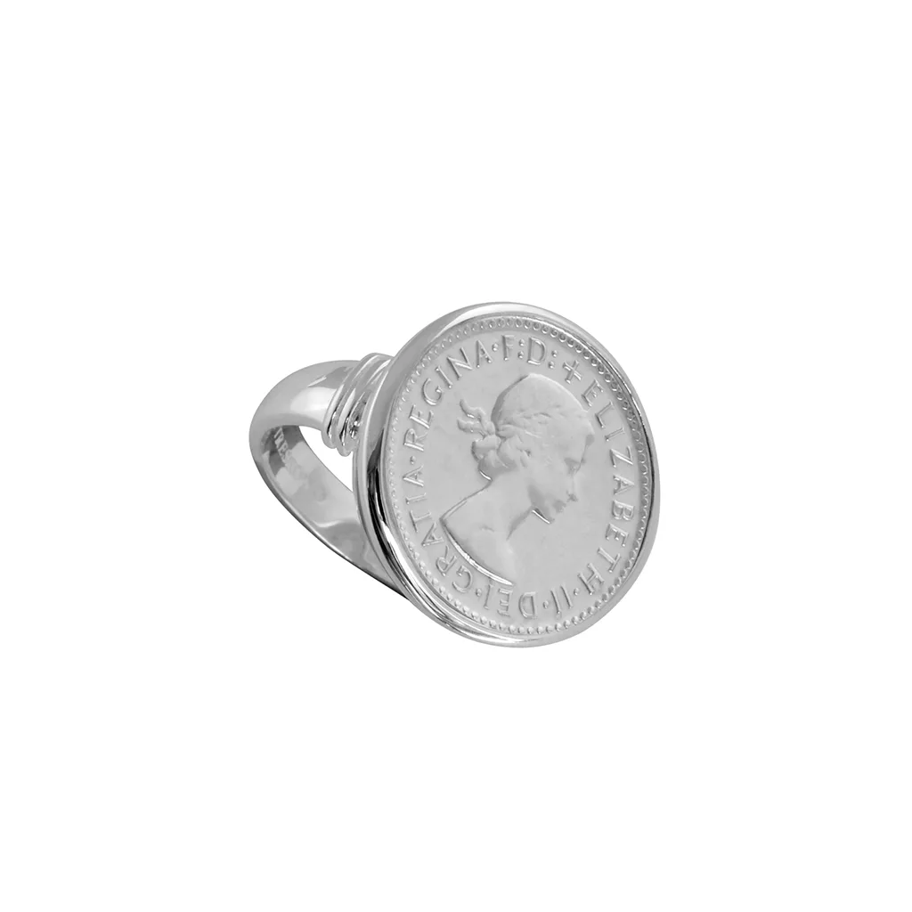 From Von Treskow’s iconic coin collections, the authentic Australian sixpence coin ring. This piece includes a real Australian sixpence coin encased within sterling silver and set into its band.