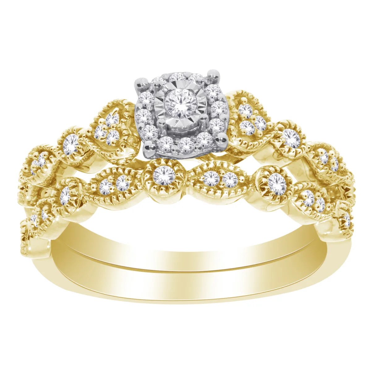 10K Yellow And White Gold Round Brilliant Cut Vinatge Bridal Set Total Diamond Weight 0.25ct Grade H